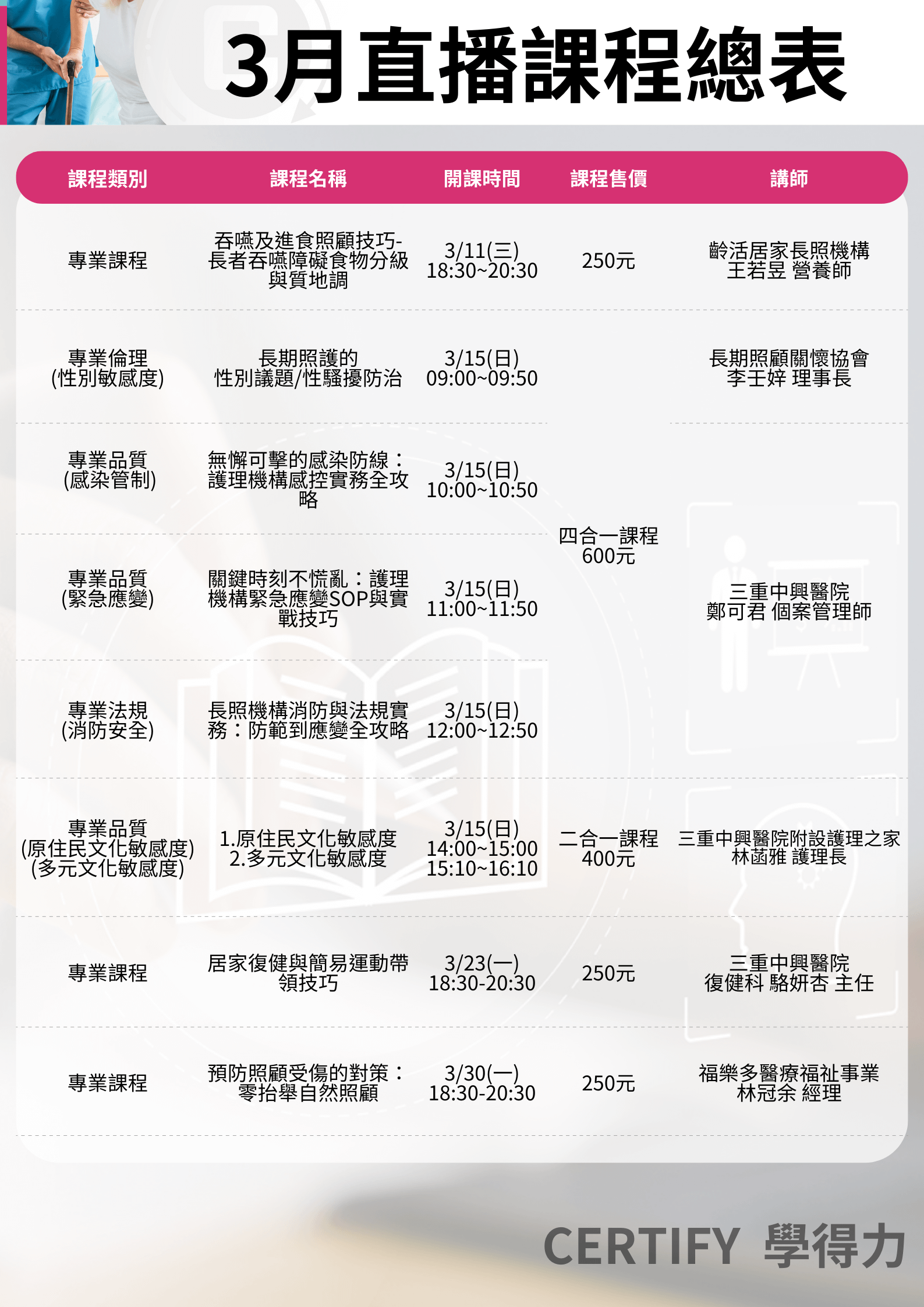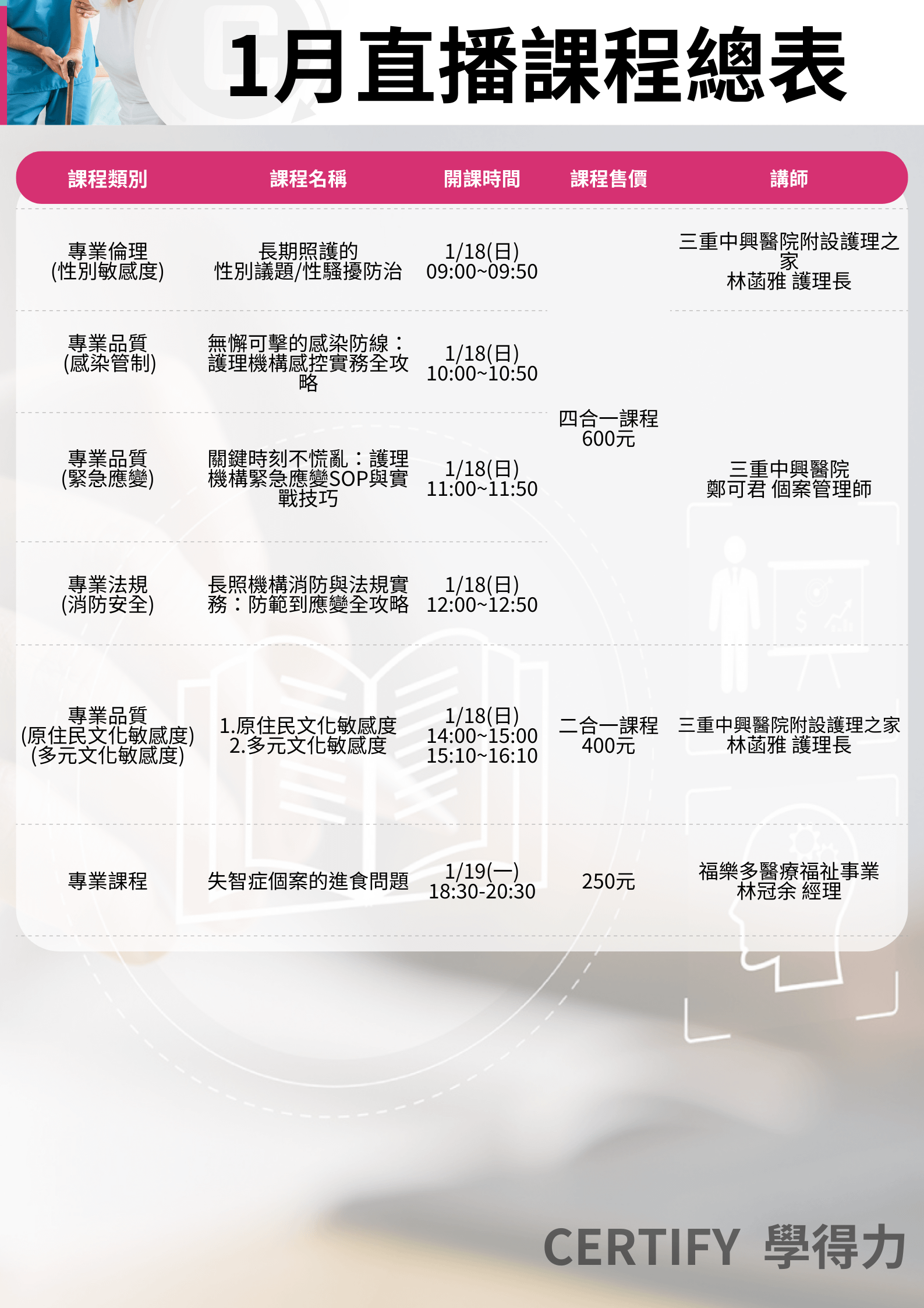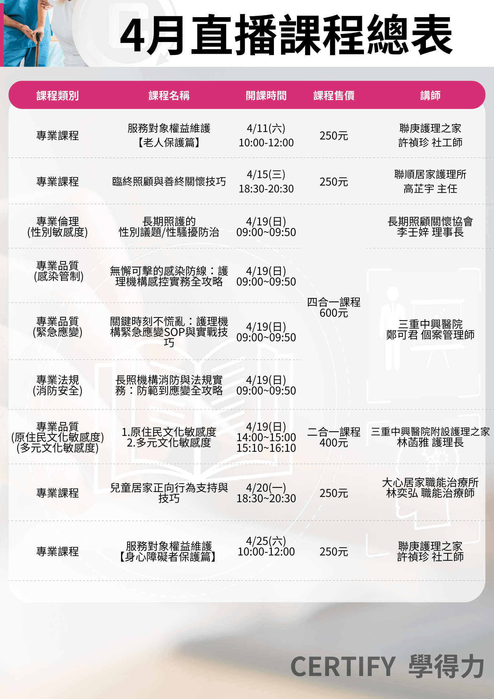 - 課程設計依衛福部及審查單位直播課程之相關規定,請確定課程後再報名參加。