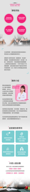 老師希望透過課程讓學員了解不同族群的營養需求,並能具備實務應用的能力!