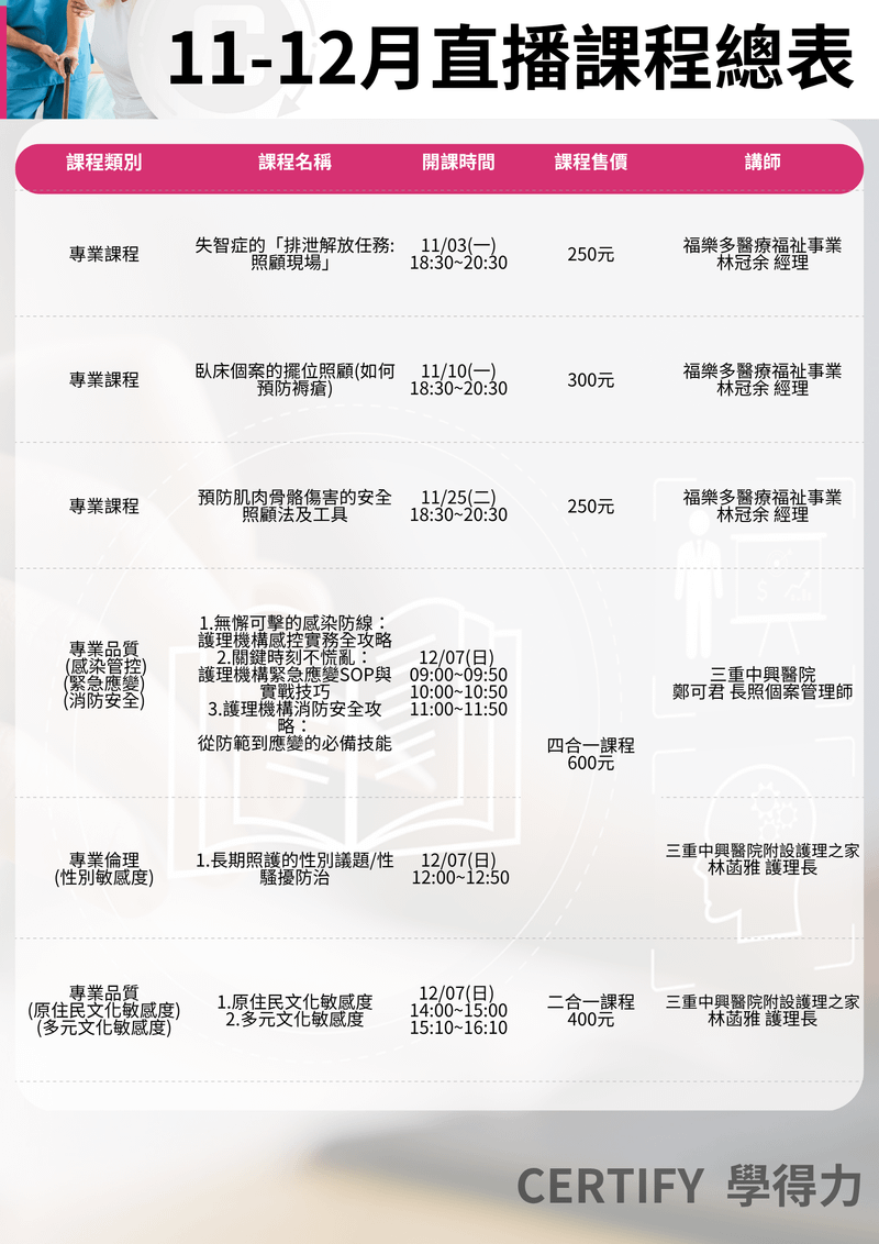- 課程設計依衛福部及審查單位直播課程之相關規定,請確定課程後再報名參加。